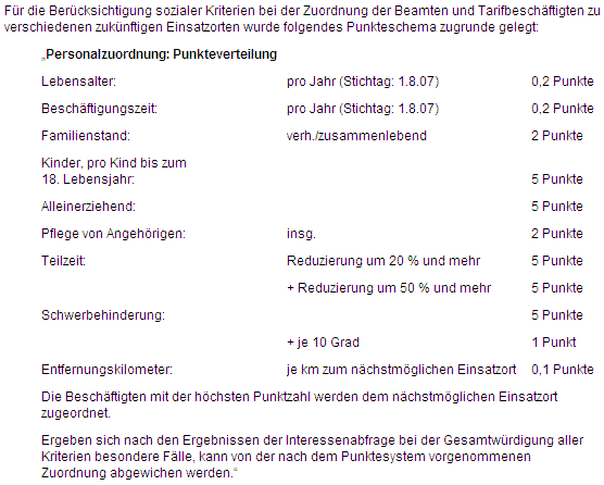 Vorinstanzen: 11 Sa 1131/08 Landesarbeitsgericht Hamm; Rechtskräftig: unbekannt! Personalgestellung durch Landesgesetz 1. Die Revision der Klägerin gegen das Urteil des Landesarbeitsgerichts Hamm vom 8. Januar 2009 - 11 Sa 1131/08 - wird zurückgewiesen. 2. Die Klägerin hat die Kosten der Revision zu tragen. Die Parteien streiten über die Berechtigung des beklagten Landes, die Klägerin im Wege der Personalgestellung der kreisfreien Stadt Bottrop zur Erbringung der Arbeitsleistung zur Verfügung zu stellen. 2 Die 1966 geborene Klägerin ist seit 1985 für das beklagte Land als Sachbearbeiterin im gehobenen Dienst tätig mit einer wöchentlichen Arbeitszeit von 19,92 Stunden. Bis zum 31. Dezember 2007 war sie im Versorgungsamt Gelsenkirchen mit Aufgaben nach dem Bundeselterngeld- und Elternzeitgesetz betraut. Die Klägerin ist verheiratet. Sie begleitet ihre bei Klageerhebung im März 2008 12 Jahre alte Tochter auf dem Schulweg bis zur Bushaltestelle und in der dunklen Jahreszeit bis zur Schule. 3 Am 21. November 2007 trat das Gesetz zur Eingliederung der Versorgungsämter in die allgemeine Verwaltung des Landes Nordrhein-Westfalen (VersÄmtEinglG) als Artikel 1 des Zweiten Gesetzes zur Straffung der Behördenstruktur in Nordrhein-Westfalen vom 30. Oktober 2007 (Straffungsgesetz) in Kraft (GV NRW 2007 S. 482, ausgegeben am 20. November 2007). 4 Dort ist auszugsweise geregelt: (1) Die den Versorgungsämtern übertragenen Aufgaben werden nach Maßgabe dieses Gesetzes den Kreisen und kreisfreien Städten, den Landschaftsverbänden und den Bezirksregierungen übertragen. (2) Die Beamten und die tariflich Beschäftigten der Versorgungsämter gehen nach Maßgabe dieses Gesetzes auf die Kreise und kreisfreien Städte, auf die Landschaftsverbände, auf die Bezirksregierungen und auf das Landesamt für Personaleinsatzmanagement über bzw. werden im Wege der Personalgestellung zur Aufgabenwahrnehmung zur Verfügung gestellt. (3) Die Versorgungsämter Aachen, Bielefeld, Dortmund, Düsseldorf, Duisburg, Essen, Gelsenkirchen, Köln, Münster, Soest und Wuppertal werden mit Ablauf des 31. Dezember 2007 aufgelöst. … (1) Die den Versorgungsämtern übertragenen Aufgaben nach dem Bundeselterngeld- und Elternzeitgesetz werden mit Wirkung vom 1. Januar 2008 auf die Kreise und kreisfreien Städte übertragen. (2) … (1) Die mit Aufgaben nach §§ 2 bis 5 und nach § 8 Abs. 2 betrauten tariflich Beschäftigten der Versorgungsämter werden kraft Gesetzes mit Wirkung vom 31. Dezember 2007 in das Ministerium für Arbeit, Gesundheit und Soziales übergeleitet und nach Maßgabe der Absätze 5 bis 7 und der §§ 11 bis 21 den dort genannten kommunalen Körperschaften kraft Gesetzes mit Wirkung vom 1. Januar 2008 im Wege der Personalgestellung zur Aufgabenwahrnehmung zur Verfügung gestellt. (2) Die mit Aufgaben nach §§ 6 und 8 Abs. 1 betrauten tariflich Beschäftigten der Versorgungsämter gehen kraft Gesetzes mit Wirkung vom 1. Januar 2008 nach Maßgabe des Absatzes 5 und des § 13 Abs. 4 und 5 auf die Bezirksregierung Münster über. Die mit Aufgaben nach § 7 betrauten tariflich Beschäftigten der Versorgungsämter gehen kraft Gesetzes mit Wirkung vom 1. Januar 2008 nach Maßgabe des Absatzes 5 und der §§ 11 bis 21 auf die Bezirksregierungen über. (3) Tariflich Beschäftigte der Versorgungsämter, die nicht unmittelbar mit Aufgaben nach §§ 2 bis 8 betraut sind, gehen nach Maßgabe des Absatzes 5 kraft Gesetzes mit Wirkung vom 1. Januar 2008 auf die Bezirksregierungen über oder werden kraft Gesetzes entsprechend Absatz 1 mit Wirkung vom 31. Dezember 2007 in das Ministerium für Arbeit, Gesundheit und Soziales übergeleitet und kraft Gesetzes nach Maßgabe der Absätze 5 bis 7 mit Wirkung vom 1. Januar 2008 den in §§ 11 bis 21 genannten kommunalen Körperschaften im Wege der Personalgestellung zur Aufgabenwahrnehmung zur Verfügung gestellt, sofern sie nicht nach Absatz 4 in das Landesamt für Personaleinsatzmanagement übergehen. (4) Die tariflich Beschäftigten der Versorgungsämter, die nicht von den Personalgestellungsverträgen nach Absatz 6 erfasst sind und nicht nach Absatz 2 oder 3 auf die Bezirksregierungen übergehen, gehen kraft Gesetzes mit Wirkung vom 1. Januar 2008 in das Landesamt für Personaleinsatzmanagement über. Betriebsbedingte Kündigungen und entsprechende Änderungskündigungen mit dem Ziel der Herabstufung sind ausgeschlossen. (5) Das Ministerium für Arbeit, Gesundheit und Soziales bereitet den Personalübergang nach den Absätzen 1 bis 4 vor der Übertragung der Aufgaben auf der Grundlage eines von ihm erstellten Zuordnungsplans vor. Der Zuordnungsplan ist unter Berücksichtigung sozialer Kriterien und dienstlicher Belange zu erstellen; eine angemessene Mitwirkung der neuen Aufgabenträger ist zu gewährleisten. (6) Soweit die tariflich Beschäftigten kommunalen Körperschaften zur Aufgabenwahrnehmung zur Verfügung gestellt werden, werden die Einzelheiten der Personalgestellung in den zwischen dem Land Nordrhein-Westfalen, vertreten durch das Ministerium für Arbeit, Gesundheit und Soziales, und den in §§ 11 bis 21 genannten Körperschaften für jedes Versorgungsamt geschlossenen Personalgestellungsverträgen geregelt. (7) Soweit tariflich Beschäftigte den kommunalen Körperschaften im Wege der Personalgestellung zur Aufgabenwahrnehmung zur Verfügung gestellt werden, bleiben die Beschäftigungsverhältnisse zum Land Nordrhein-Westfalen auf der Grundlage der für das Land geltenden Tarifverträge und Vereinbarungen über die zusätzliche Alters- und Hinterbliebenenversorgung bestehen. … (1) Die mit Aufgaben nach §§ 2 und 5 betrauten Beamten gehen, soweit es für die Aufgabenerfüllung erforderlich ist, entsprechend den von ihnen wahrgenommenen Aufgaben anteilig auf die kreisfreien Städte Bottrop und Gelsenkirchen sowie den Kreis Recklinghausen über. … (5) Die Regelungen der Absätze 1, 2 und 4 gelten für tariflich Beschäftigte im Wege der Personalgestellu